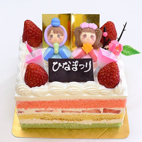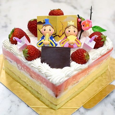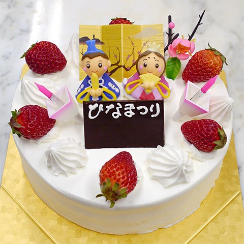 苺をサンドしたショートケーキに、お人形、桃の花、ぼんぼりロウソク×2でデコレーションしました。