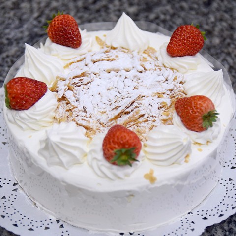 当店自慢のしっとりスポンジを三枚にスライスし、甘さ控えめの生クリームで仕上げました。